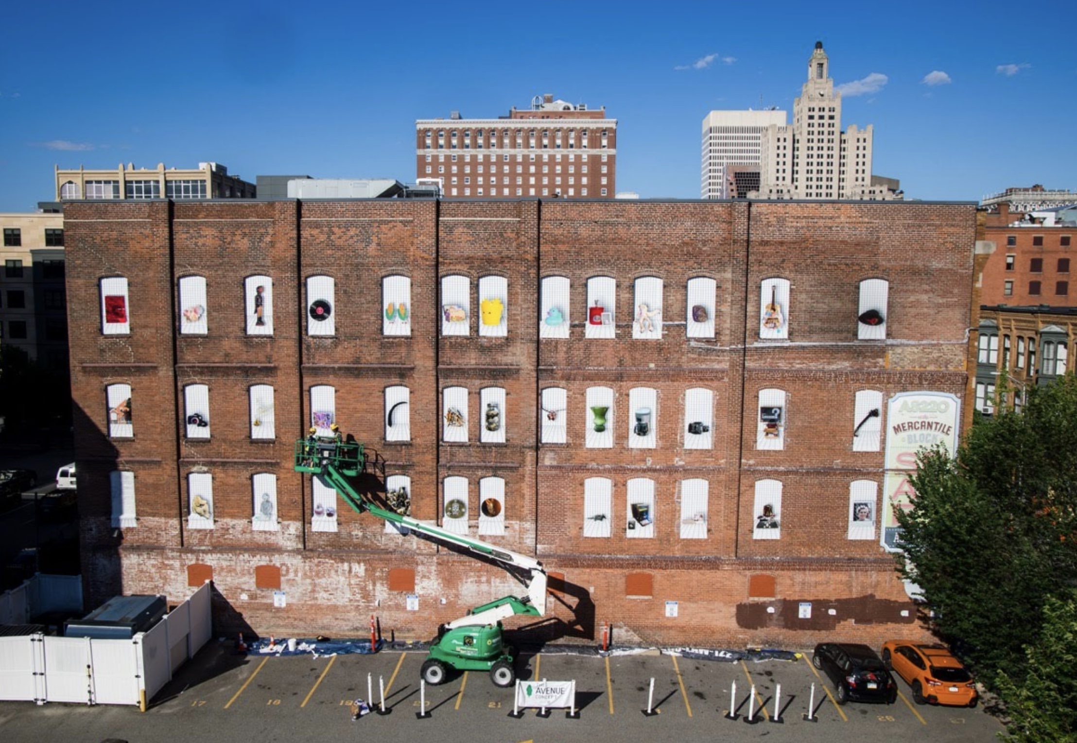 During these sessions, stories were collected and documented with audio and photographs. The objects and their histories were incorporated into the design of the PVD Cabinet of Curiosities, on a prominent wall of AS220’s Mercantile Building. This large-scale mural represents a visual archive of collective memory in the city of Providence, becoming a vessel of Providence’s rich and layered histories told through the stories of the people who live here.