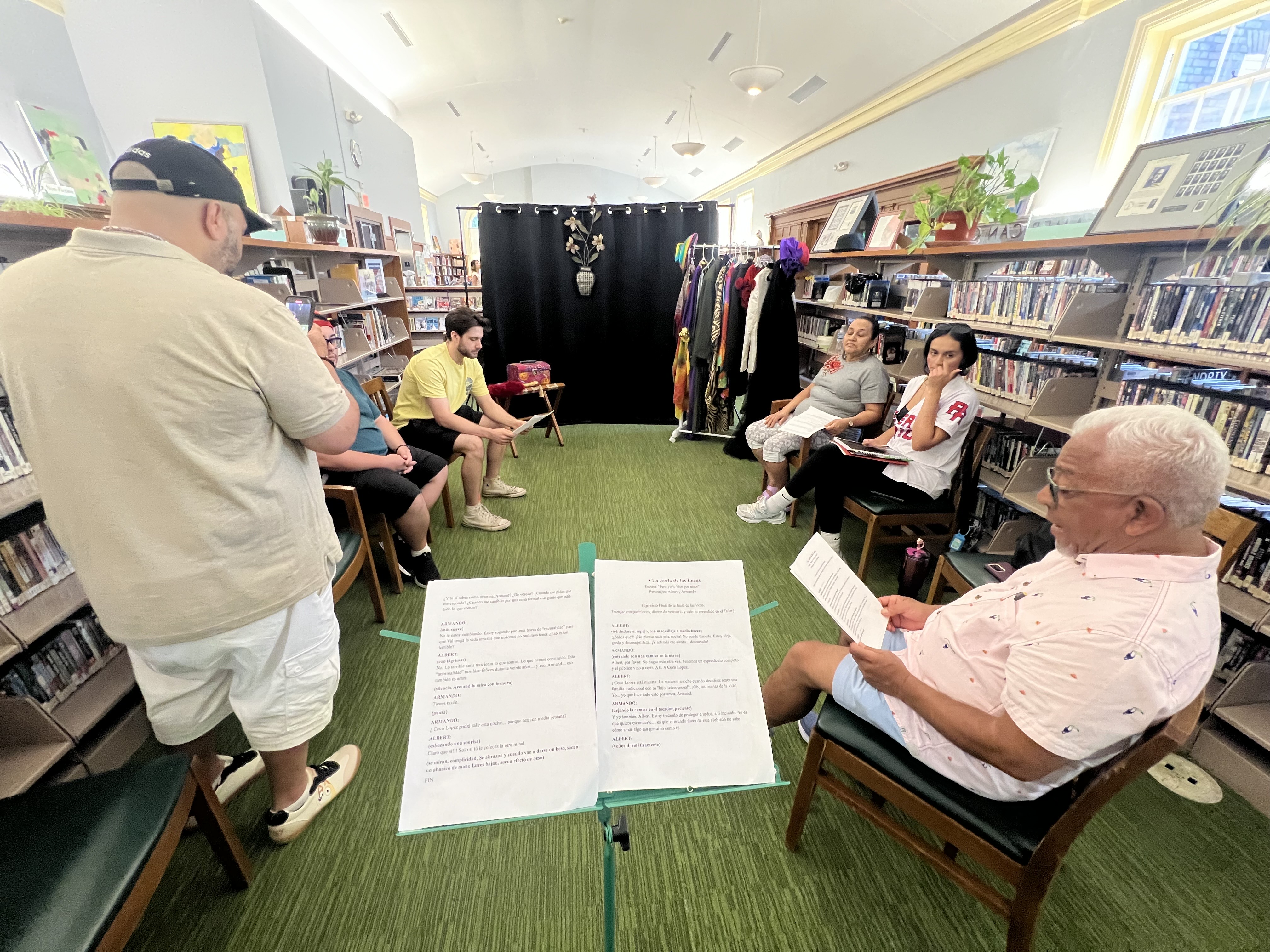 In the South Providence Community Library, the theater group Arte Latino New England (ALNE) offered theater sessions in Spanish and workshopped scenes from the Birdcage. To culminate their creative process, they adapted and staged a scene from the play which they called “Jaula Charla Bar”.